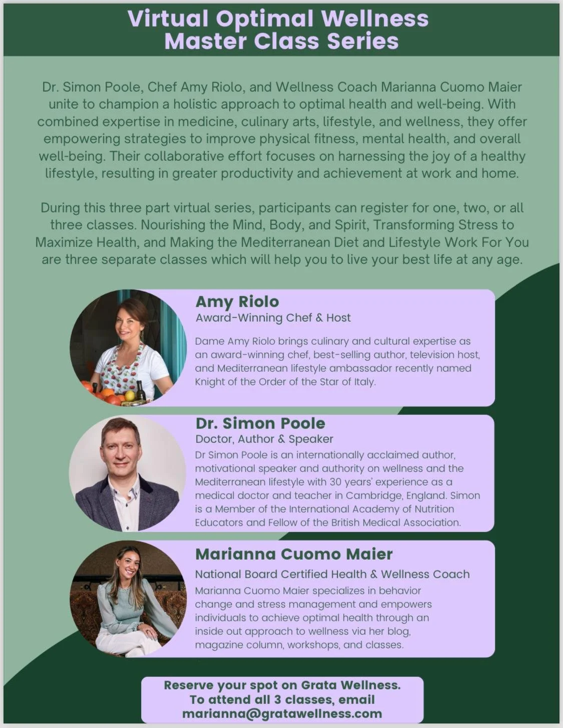 Dr. Simon Poole, Chef Amy Riolo and Wellness Coach Marianna Cuomo Maier unite to champion a holistic approach to optimal health and well-being. With combined expertise in medicine, culinary arts, lifestyle, and wellness, they offer empowering strategies to improve physical fitness, mental health, and overall well-being. Their collaborative effort focuses on harnessing the joy of a healthy lifestyle, resulting in greater productivity and achievement at work and home.