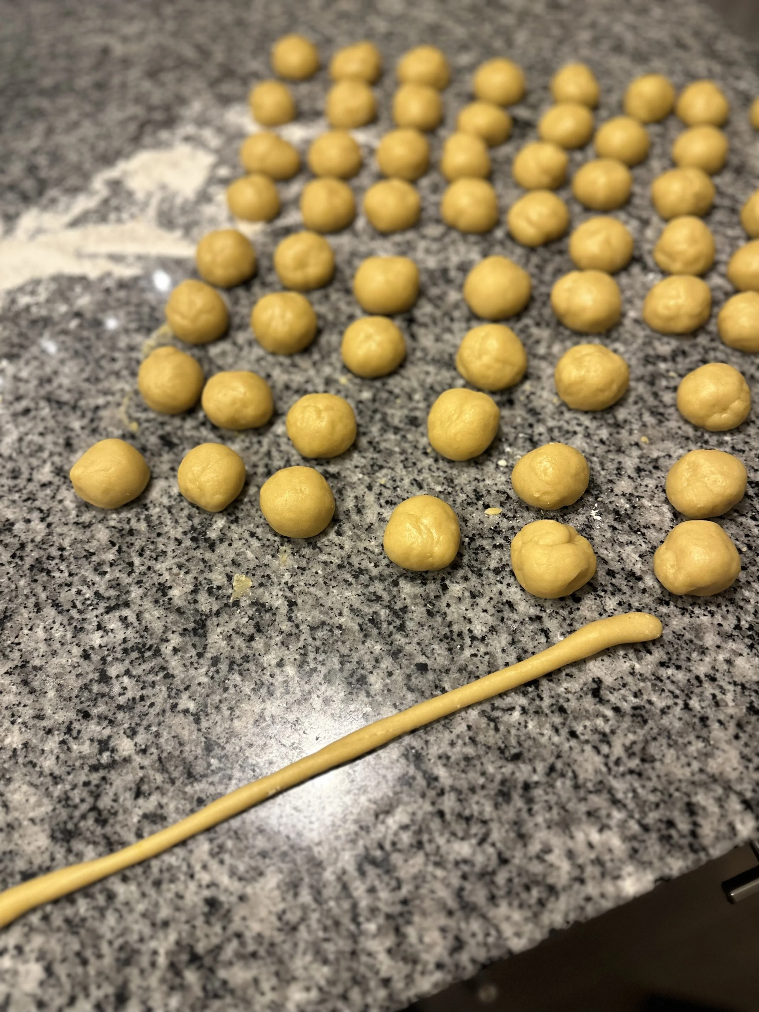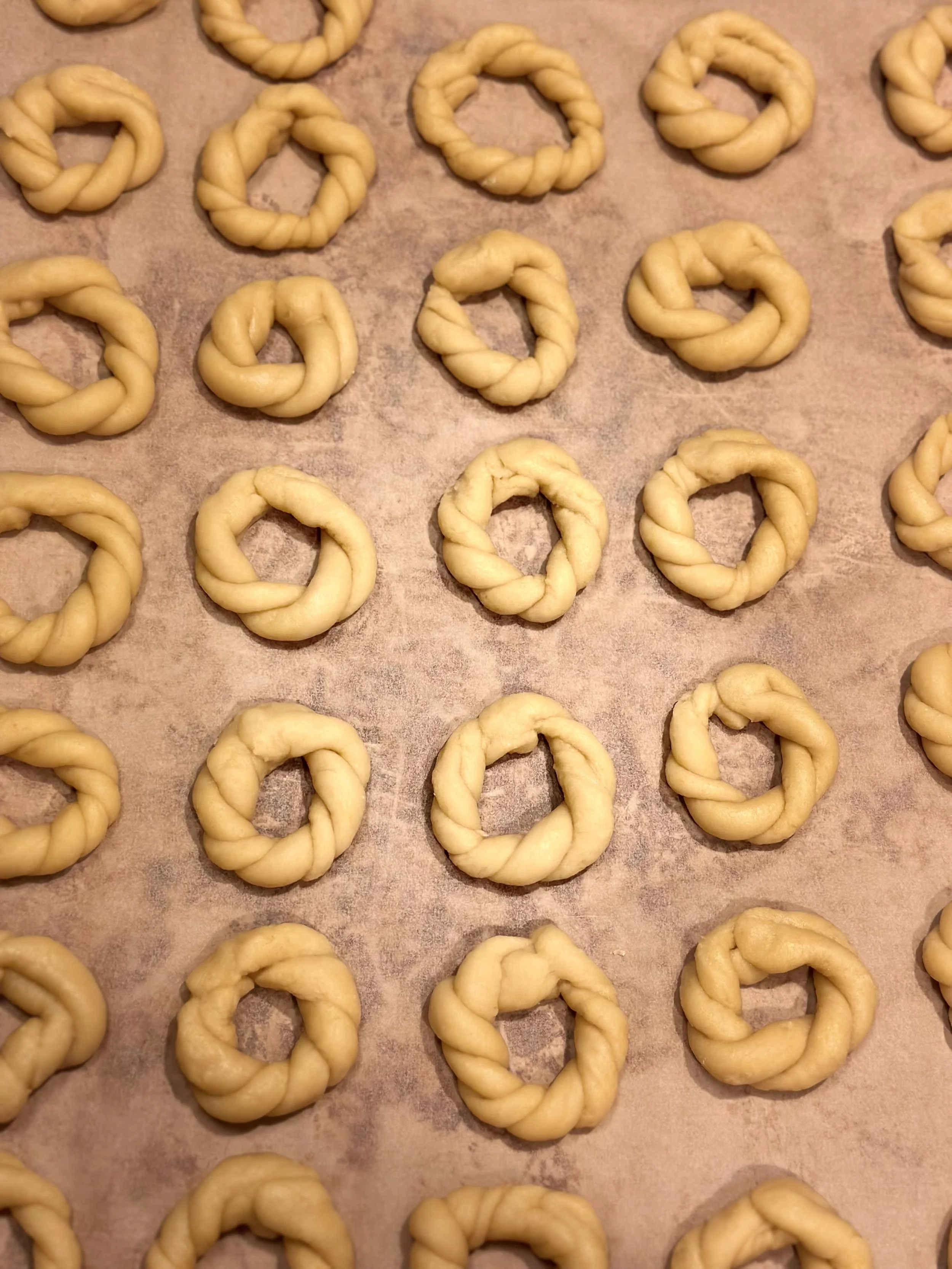 Divide the dough into uniform balls (the size of a whole walnut) and on the pastry board or work surface roll out to a long, pencil-like shape, pinch the two ends together to form a closed circle. Twist the circle to form a braid and seal the ends to form a circle shape.